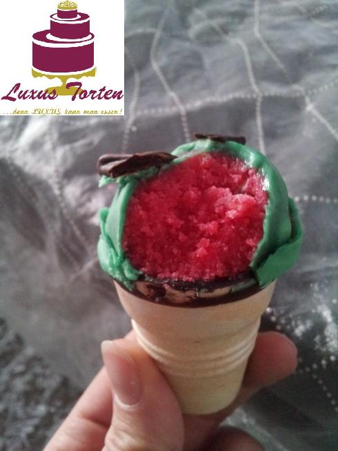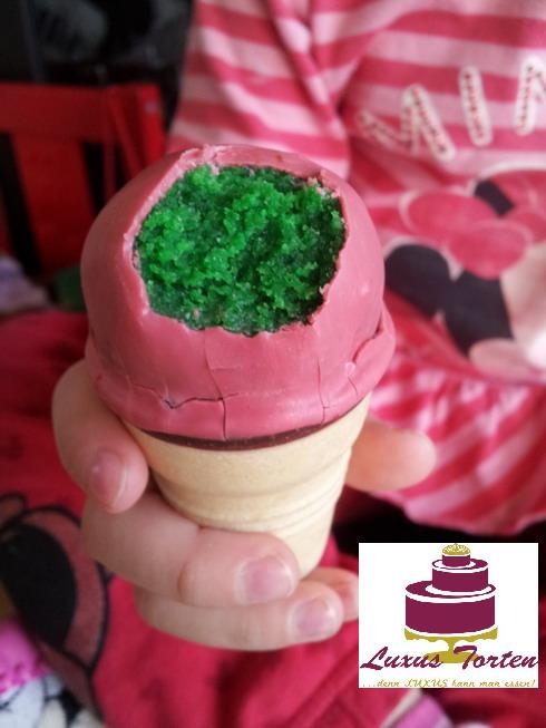 Die rosanen Cake Pops sind innen grün und die grünen innen rosa. :) Die Glasuren schmecken jeweils nach Himbeer und Apfel.