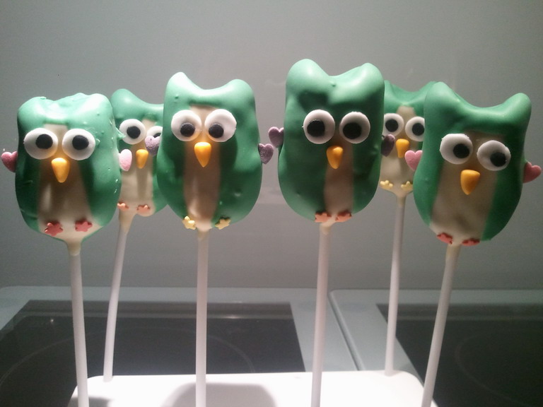 Diese Cake-Pops sind super niedlich und sehr lecker! Es waren Schoko-Pops, überzogen mit gefärbter weißer Schokolade.
