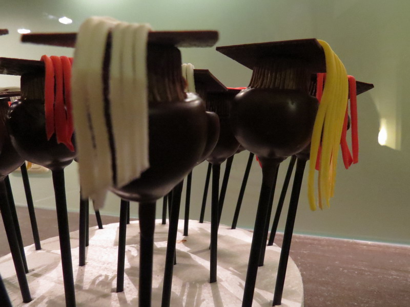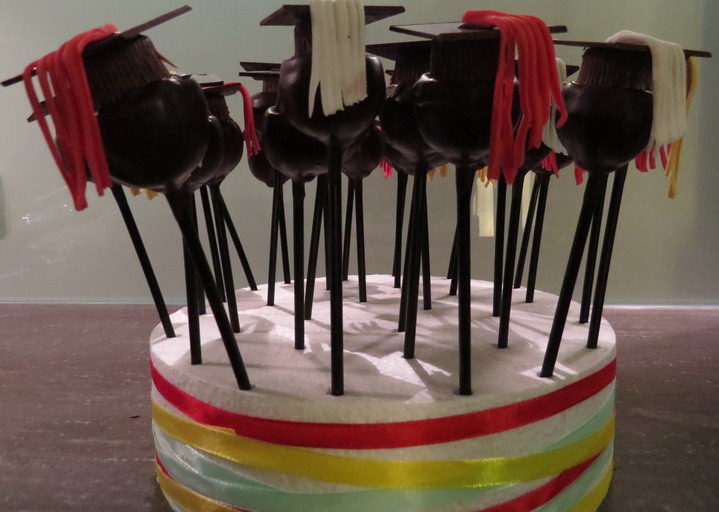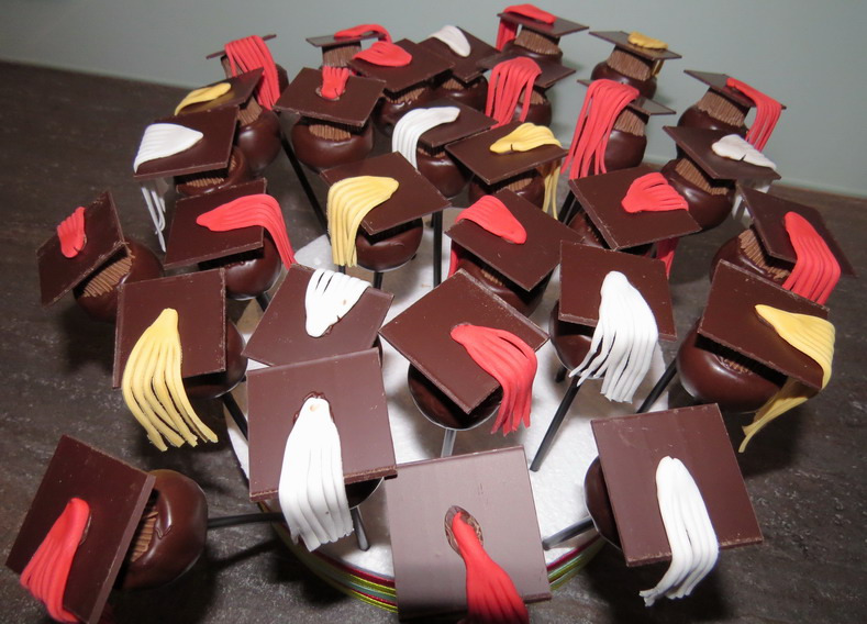 Es sind Schoko-Rum-Pops mit Eiskonfekt und Zartbitter-Schoko-Blättchen. Den Bommel hab ich aus farbigen Fondant geformt.