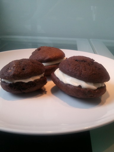 Diese zwar etwas süßen aber sehr leckeren Schoko-Whoopies mit Ahornsirupfüllung gab's am Sonntag Nachmittag. Ich habe kein Whoopie-Blech, deswegen habe ich sie auf einer Macaron-Silikonmatte gebacken. Somit sind sie kleiner geworden. Was aber nicht schlimm war, denn so konnte man mehrere essen! ;)