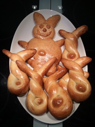 Und das, was sie da gezeigt hat, habe ich dann gleich mal nachgebacken. Leckerer Hefeteig in Form von süßen kleinen Häschen.