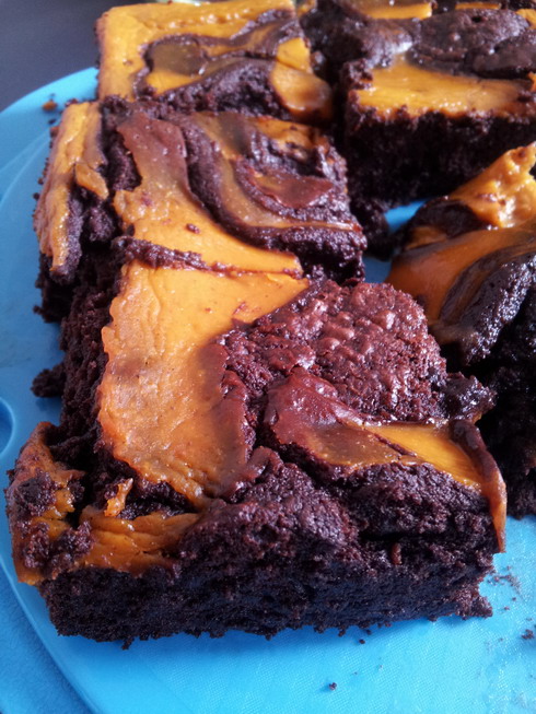 Teig in die Form streichen. Die Kürbiscreme esslöffelweise daraufgeben und wie bei einem Marmorkuchen unterziehen. Brownies im Ofen ca. 30 Minuten backen.