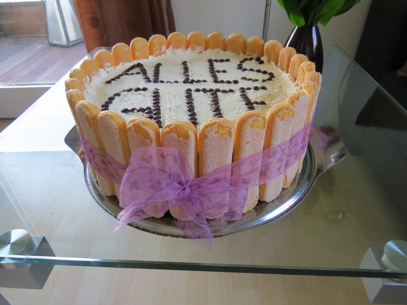 Zur Deko kann man nun die Torte mit Ganache bestreichen und dann mit Fondant eindecken, oder 200ml Sahne steif schlagen, die Torte damit rundherum bestreichen. An die Seite Löffelbiskuits kleben und oben mit z.B. Schokostückchen garnieren.