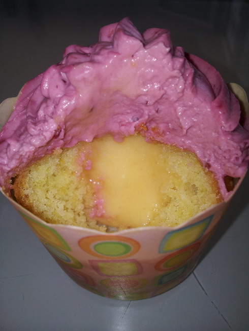 Mit einem Apfelentkerner oder einem Melonenausstecher oder einem kleinen runden Plätzchenausstecher ein Loch /Mulde in die erkalteten Cupcakes stechen. Dieses Loch bis obenhin mit Lemon Curd füllen.