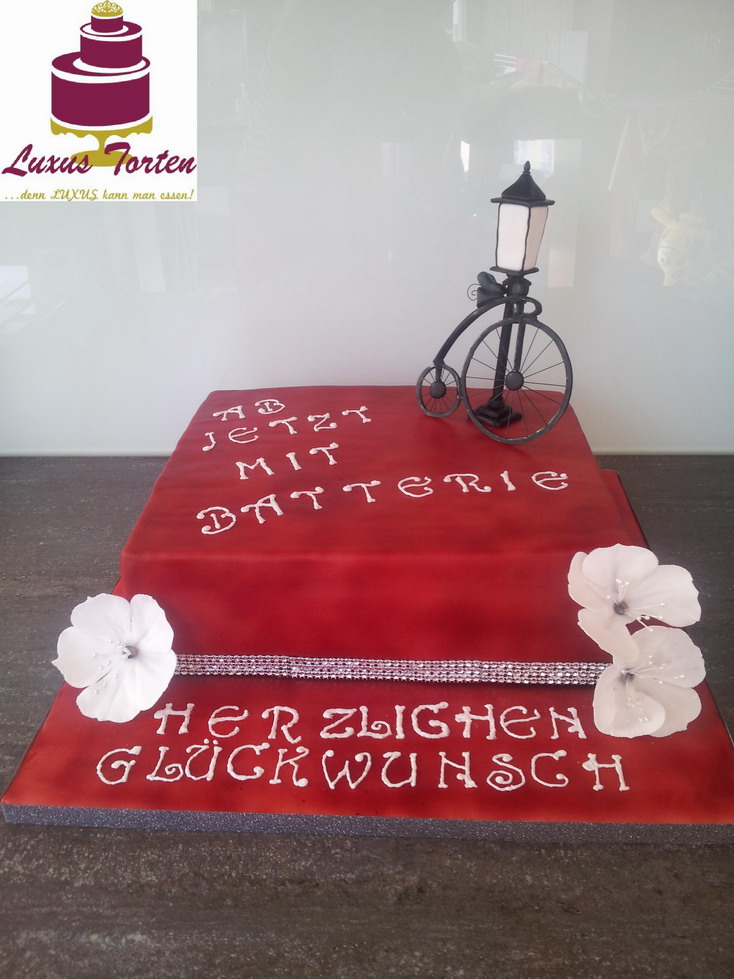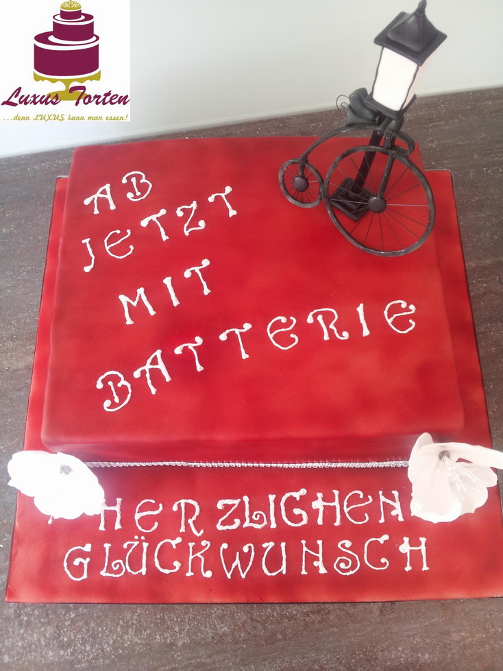 Meine Patentante hatte am Sonntag ihren 60. Geburtstag. Und natürlich hat sie dazu eine passende Torte von mir bekommen. Sie möchte sich ein neues E-Bike kaufen, deshalb der Spruch mit der Batterie. ;)