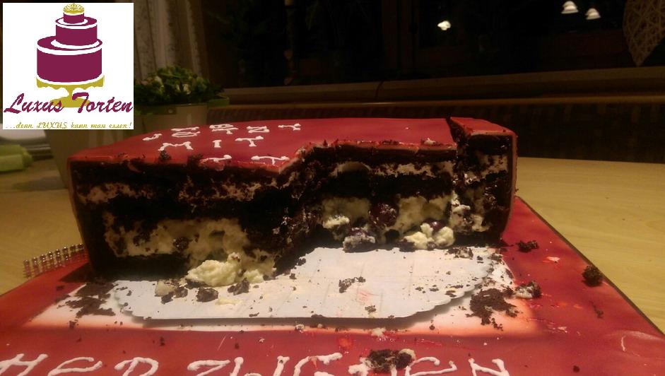 Es war ein Schokokuchen mit einer weißen Schoko-Eierlikör-Creme und einer leichten Zitronencreme und frischen Kirschen.