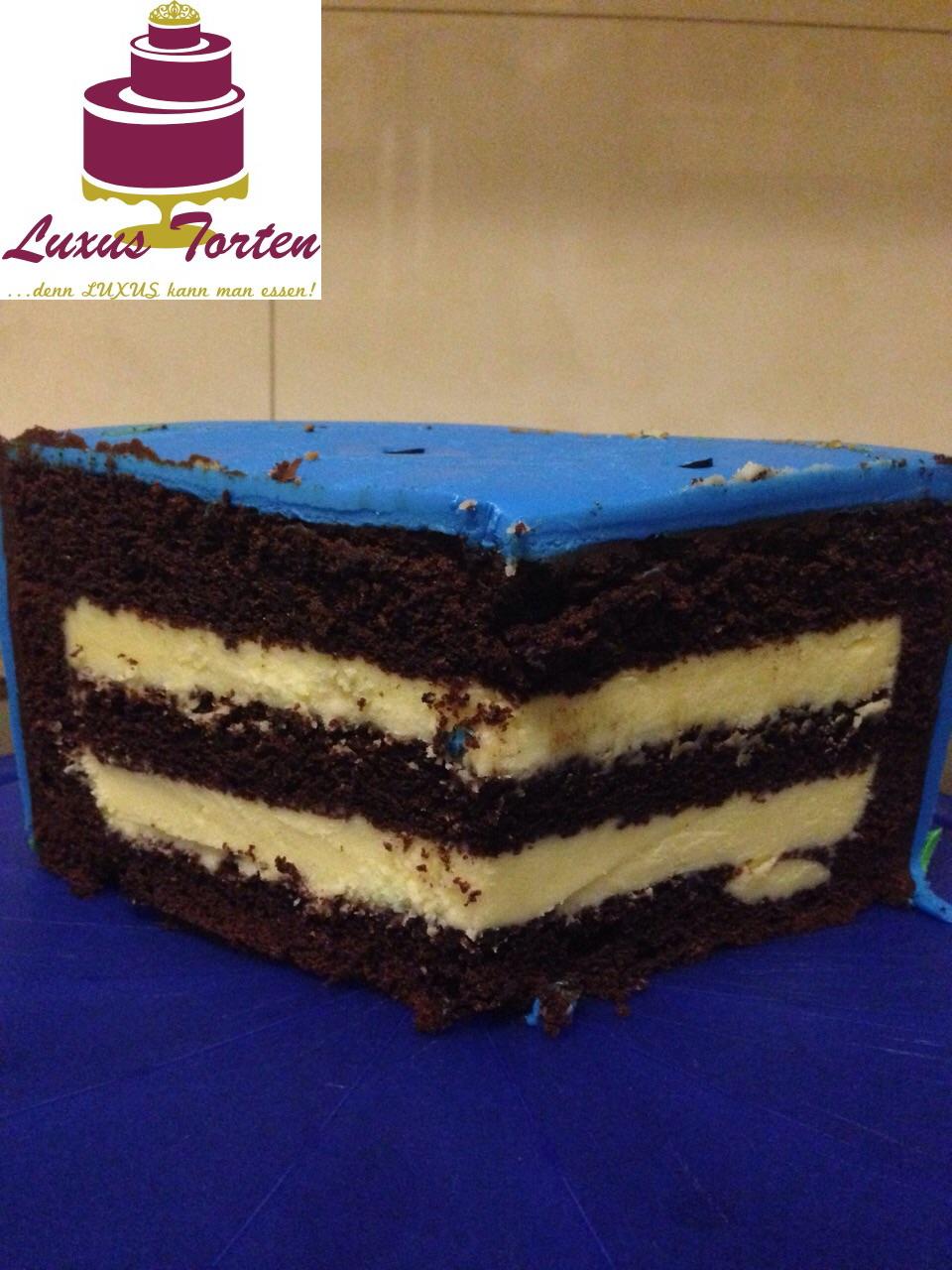 Unten war ein Schokokuchen mit weißer Schokocreme und oben ein weißer Schokokuchen mit dunkler Schokocreme. Leider gibt's vom oberen Kuchen kein Anschnittfoto! :-D