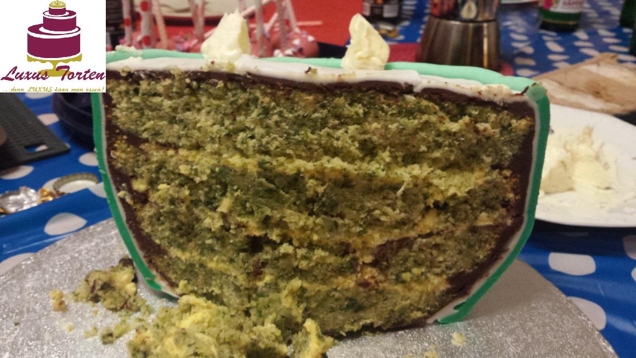 Innen verbarg sich ein Spinatkuchen mit Pfirsich-Maracuja-Füllung. Eine gewagte Variation, die aber echt sehr lecker war!