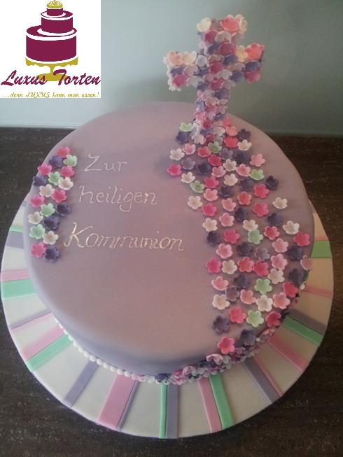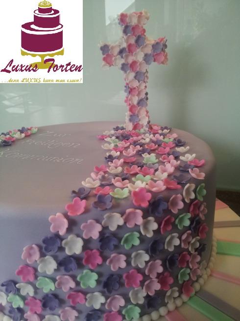 Die Torte ist nach den Wünschen des Kommunionskindes entstanden, die Farben waren vorgegeben, und sie hat sich die Streifen auf der Platte so gewünscht! :)