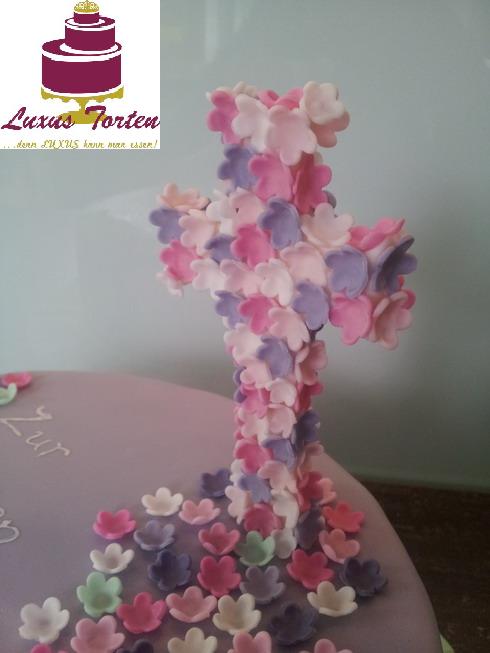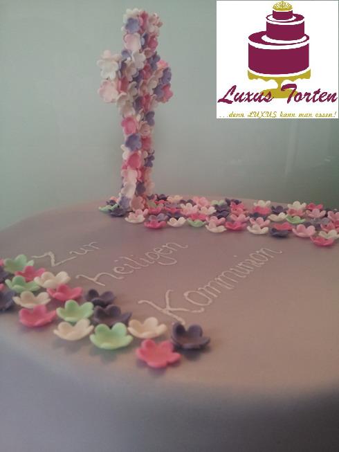 Kommunionstorte mit Blümchenkreuz und vielen Blümchen