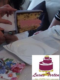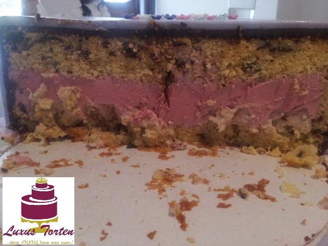 Innen war ein Stracciatella-Wunderkuchen mit Himbeer-Bananen-Füllung, auch wie gewünscht. :)