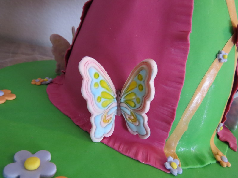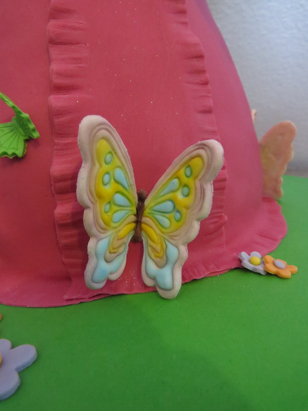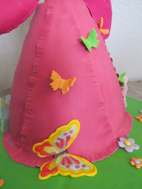Diese Torte habe ich für die Tochter einer lieben Freundin gemacht. Sie liebt Prinzessinnen und Feen und da lag es natürlich nahe, eine solche Torte für sie zu machen! Es ist ein normaler Rührkuchen für die Stabilität mit Vanillecreme gefüllt. Den Kuchen habe ich rosa gefärbt, die Creme lila. Zu einer Schmetterlings-Fee gehören natürlich viele Schmetterlinge und Blümchen! Die habe ich alle aus Fondant gemacht. Die Schmetterlinge sind mit Puderfarbe bemalt. Glitzer darf natürlich auch nicht fehlen, der kommt auf den Fotos nur leider nicht soooo gut raus.
