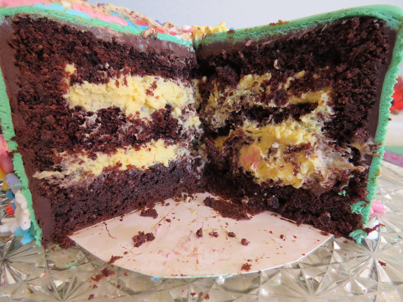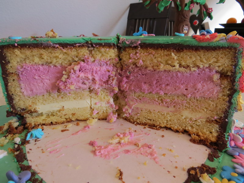 Die untere Torte ist ein Wunderkuchen mit Kokos-Pudding und Himbeer-Brombeer-Füllung. Die obere Torte ist ein Schokokuchen mit Pfirsich-Maracuja-Füllung. Das hat sich auch meine Kleine so gwünscht. :)