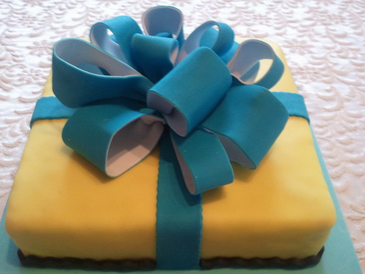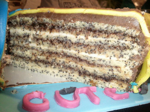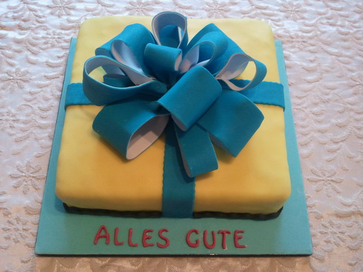 Für meinen Papa zum Geburtstag gab's ein schönes Geburtstagsgeschenk mit großer Schleife. Innen war eine Mohn-Schicht-Torte mit Pflaumenmus und Pudding-Quark-Creme.
