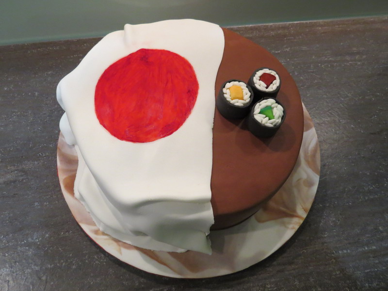 Mein Papa hat beim japanischen Konsulat gearbeitet und hatte dort seinen letzten Arbeitstag. Drum gab's hier eine Japan-Torte mit Flagge und Sushi. Innen war ein Schokokuchen mit Pfirsich-Maracuja-Creme.