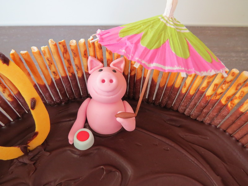 Ich habe die Torte dann einfach mit Ganache eingestrichen, an den Rand die Mikado-Stäbchen geklebt und oben die Schweinchen. Diese habe ich aus Fondant modelliert. Die "30" ist aus gelber Blütenpaste.